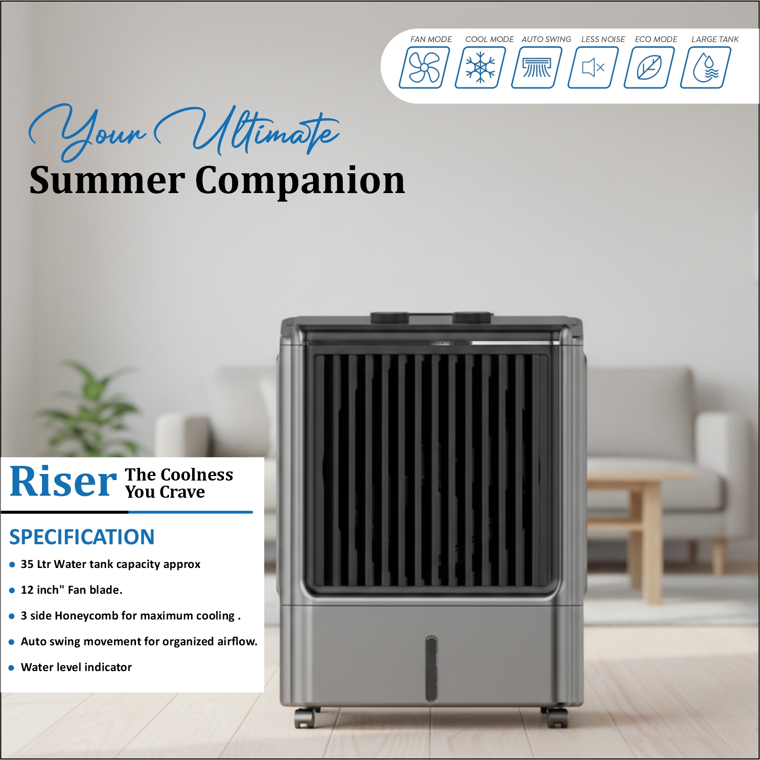 This cooler offers efficient and reliable performance with a 35-liter water tank, providing ample capacity for continuous cooling. Its 12-inch fan blade delivers strong airflow, while the 3-side honeycomb pads ensure enhanced cooling efficiency. The auto swing movement helps distribute air evenly across the room for consistent comfort. For added convenience, the cooler includes a water level indicator, making it easy to monitor and maintain the tank level.