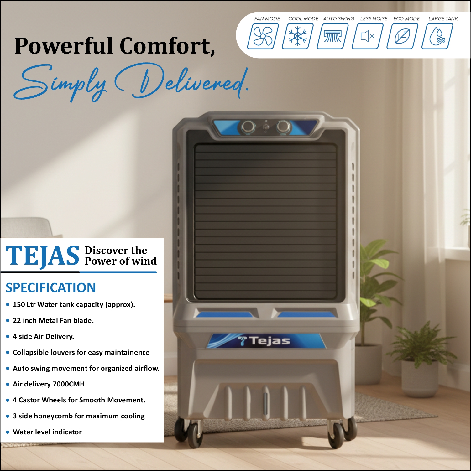 This high-capacity cooler is built for powerful, long-lasting performance, featuring a 150-liter water tank for extended cooling without frequent refills. Its robust 22-inch metal fan blade and 4-side air delivery system ensure strong, wide-area airflow. The collapsible louvers make maintenance simple, while the auto swing movement distributes air evenly for consistent comfort. With an impressive 7000 CMH air delivery, the cooler is ideal for large spaces. It also includes 4 castor wheels for easy mobility, 3-side honeycomb pads for enhanced cooling efficiency, and a water level indicator for convenient monitoring.